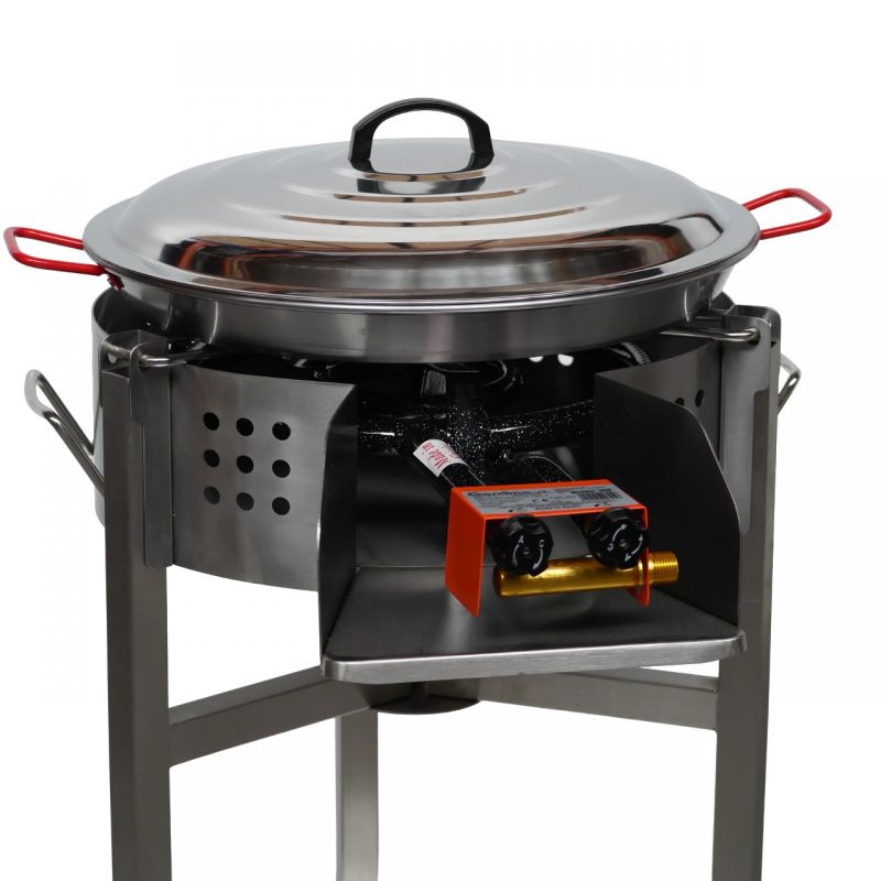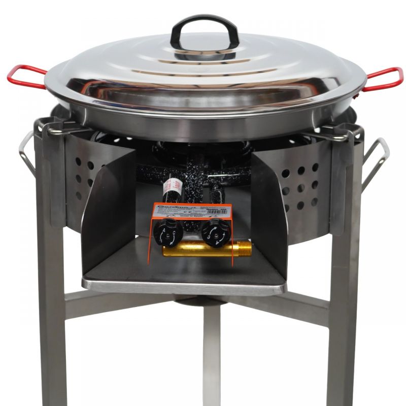 Kit à paella de luxe démontable pour 20 personnes avec plat et couvercle inoxGourmands et gourmets ce kit est fait pour vous ! Comprenant une poêle à paella en inox, un couvercle en inox, un réchaud (entrée à visser : G1/2), un pare-flamme en inox et un trépied bas ou haut, il vous permettra de réaliser des plats festifs...