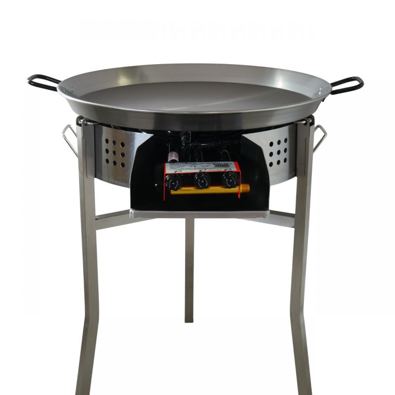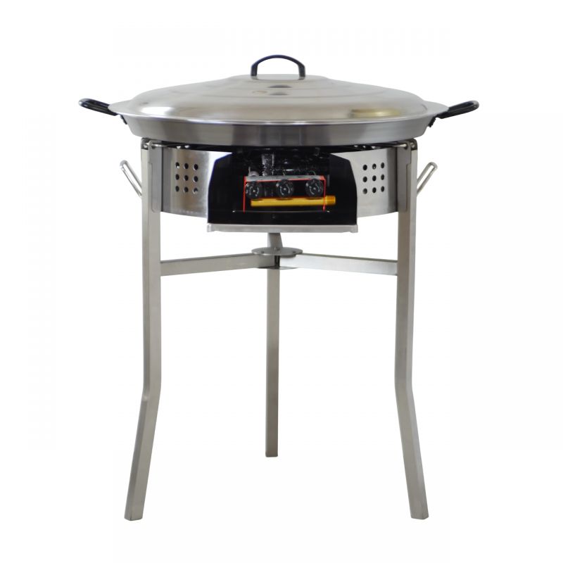 Kit à paella de luxe démontable pour 25 personnes avec plat et couvercle inoxGourmands et gourmets ce kit est fait pour vous ! Comprenant une poêle à paella en inox, un couvercle en inox, un réchaud (entrée à visser : G1/2), un pare-flamme en inox et un trépied bas ou haut, il vous permettra de réaliser des plats festifs...