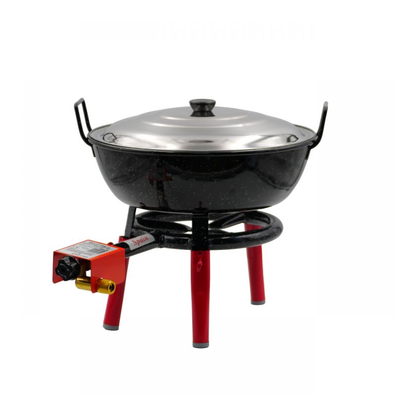 kit à poêle creuse 16 personnesCe kit comprend une poêle émaillée creuse de 8.9 litres, un réchaud à gaz (Entrée à visser : G1/2) installé sur un trépiedTuyau de gaz, détendeur et couvercle en option. L'émail protège votre plat de l'oxydation. Même après une longue période sans utilisation, il sera comme neuf. ...