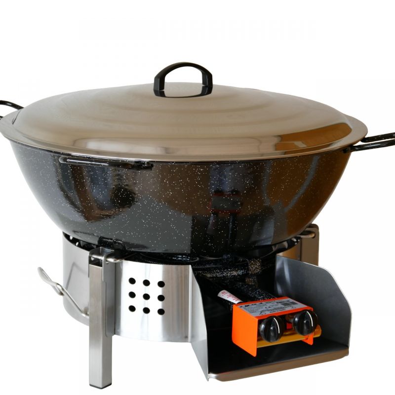 kit à poêle creuse 70 personnes Ce kit comprend une poêle émaillée creuse de 42.75 litres, un réchaud à gaz (Entrée à visser : G1/2) installé sur un trépied Tuyau de gaz, détendeur et couvercle en option. L'émail protège votre plat de l'oxydation. Même après une longue période sans utilisation, il sera comme neuf. Ce kit poêle creuse est conçu pour...