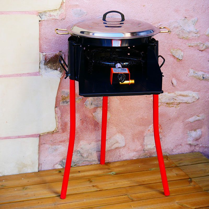 Kit à paella avec mini pieds démontables pour 50 personnes avec plat émaillé Réchaud surpuissant (entrée à visser : G1/2) avec thermocouple et veilleuse pour une utilisation in ou outdoor Ce set de cuisson regroupe une poêle émaillée, un couvercle inox, un réchaud, un pare-flamme en inox installé sur des mini pieds de 10cm conçus pour une installation...