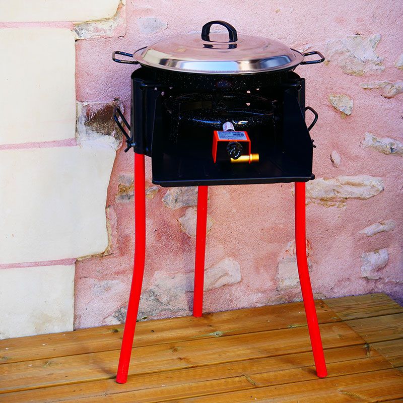 Kit à paella avec mini pieds démontables pour 50 personnes avec plat émaillé Réchaud surpuissant (entrée à visser : G1/2) avec thermocouple et veilleuse pour une utilisation in ou outdoor Ce set de cuisson regroupe une poêle émaillée, un couvercle inox, un réchaud, un pare-flamme en inox installé sur des mini pieds de 10cm conçus pour une installation...