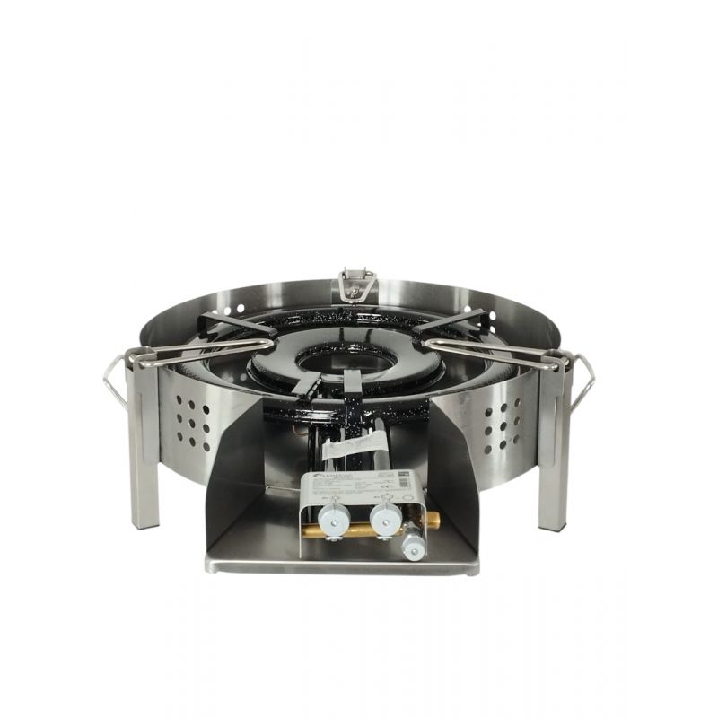 Kit à paella avec mini pieds démontables pour 85 personnes avec plat émailléRéchaud surpuissant (entrée à visser : G1/2) avec thermocouple et veilleuse pour une utilisation in ou outdoorCe set de cuisson regroupe une poêle émaillée, un couvercle inox, un réchaud, un pare-flamme en inox installé sur des mini pieds de 10cm conçus pour une...