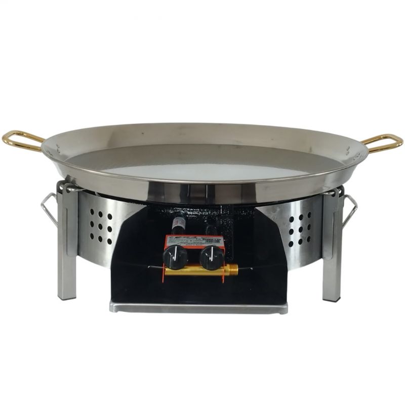 Le plat en inox de 65 cm de diamètre est idéal pour cuire votre paella géante. Légèrement évasé, avec sa forme caractéristique, il permet au riz de Valencia de cuire dans la longueur et de mieux s’imprégner des saveurs de vos autres ingrédients. Dotée de poignées solidement fixées, votre poêle a été fabriquée avec le plus grand soin comme tous les autres éléments de votre set de cuisson. C’est un vrai plaisir d’installer, d’utiliser et même de nettoyer cet équipement de très grande performance.